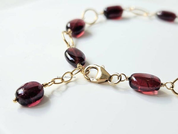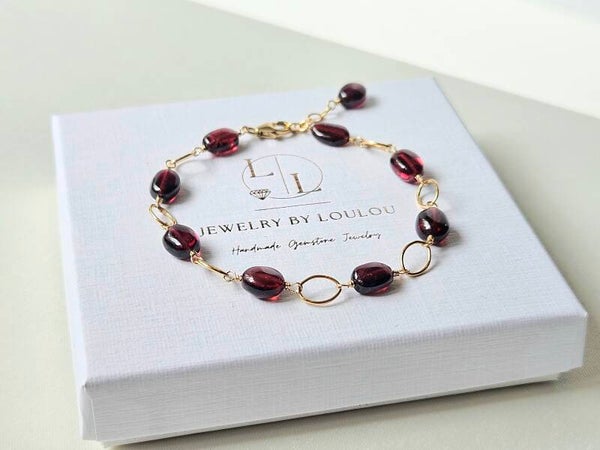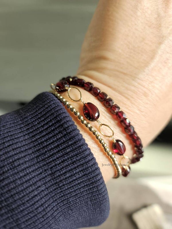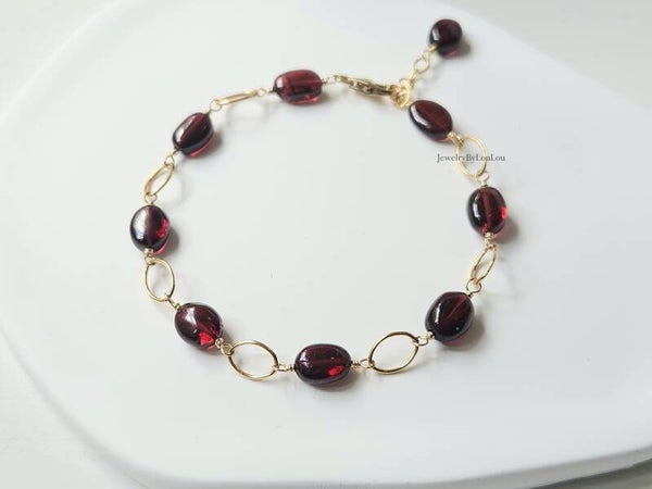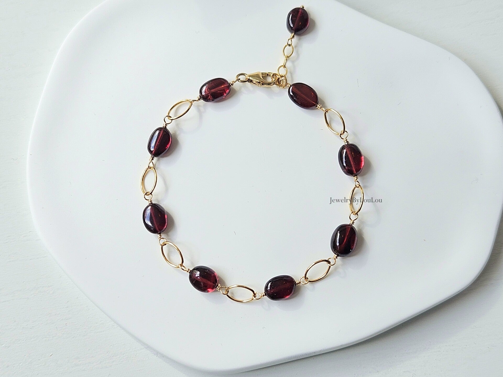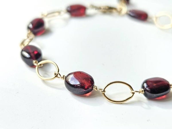 Beautiful AAA red Mozambique garnet bracelet with 14k gold-filled links. This is a new design from our Fall 2025 collection and pairs beautifully with our other garnet bracelets.