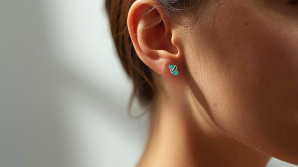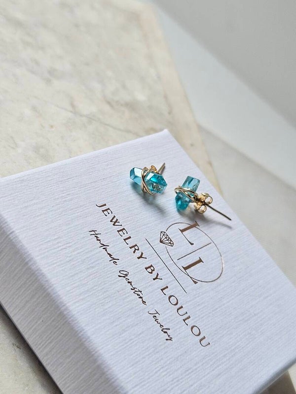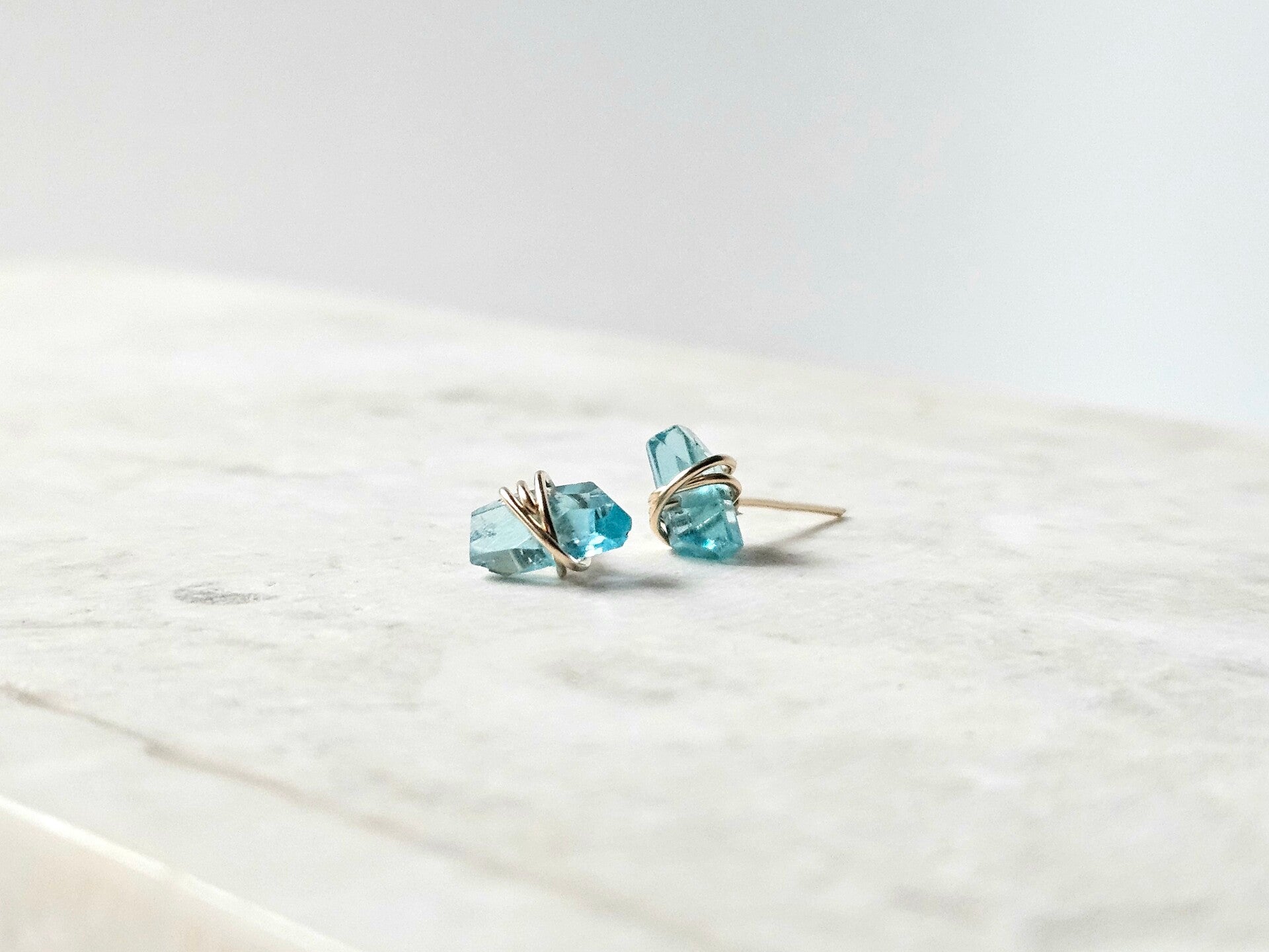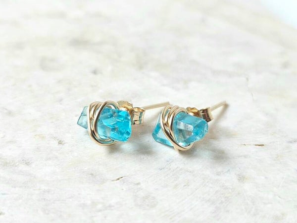 Charming handmade small gemstone stud earrings with faceted neon apatite beads. The aqua blue stones are natural, undyed, and free-form cut, so each stone is unique.