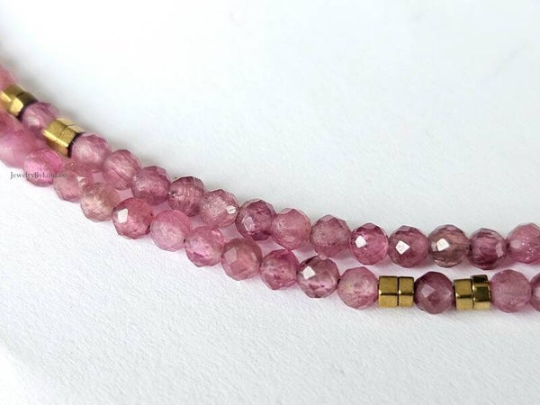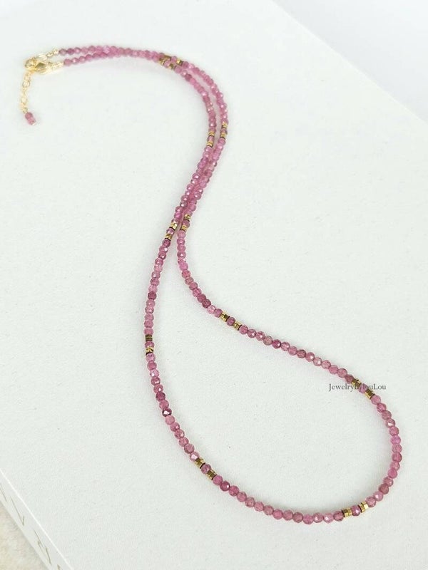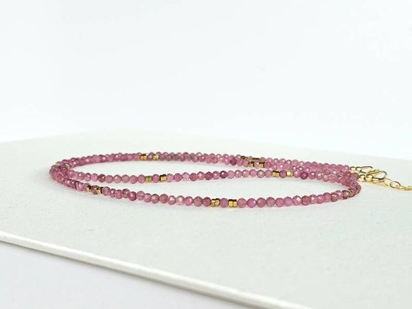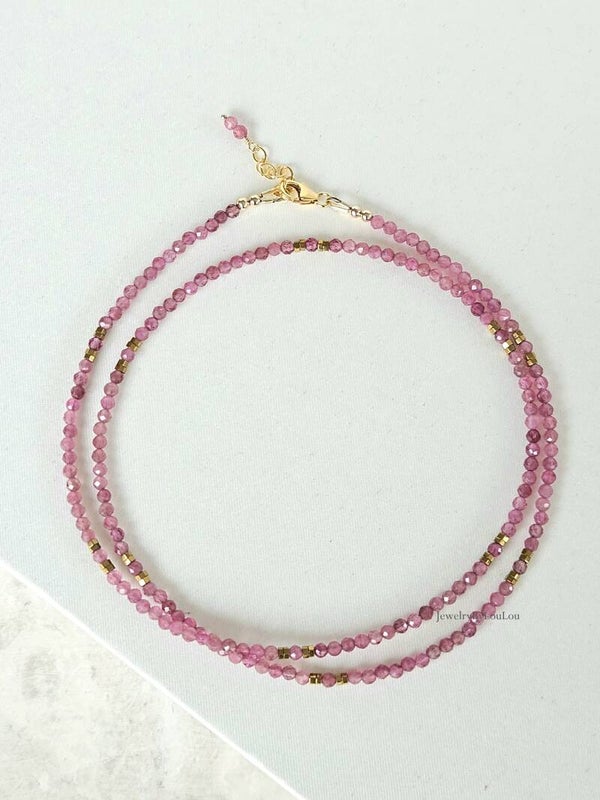Delicate, fine necklace with natural, untreated AAA pink tourmaline beads. These top-quality beads have a beautiful warm pink color and are faceted in 2.5mm beads. I also added 2mm gold hematite spacers in between.