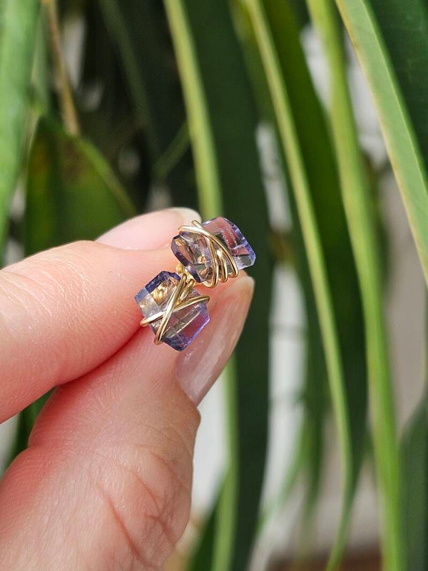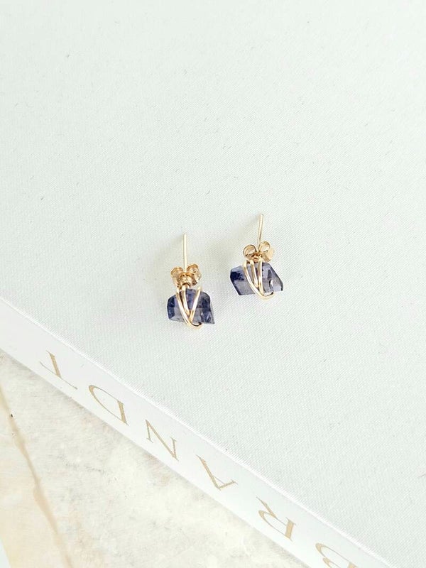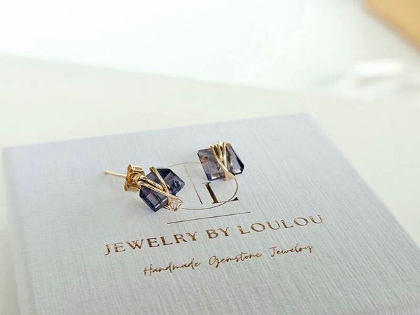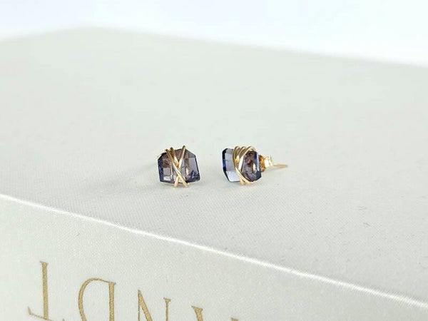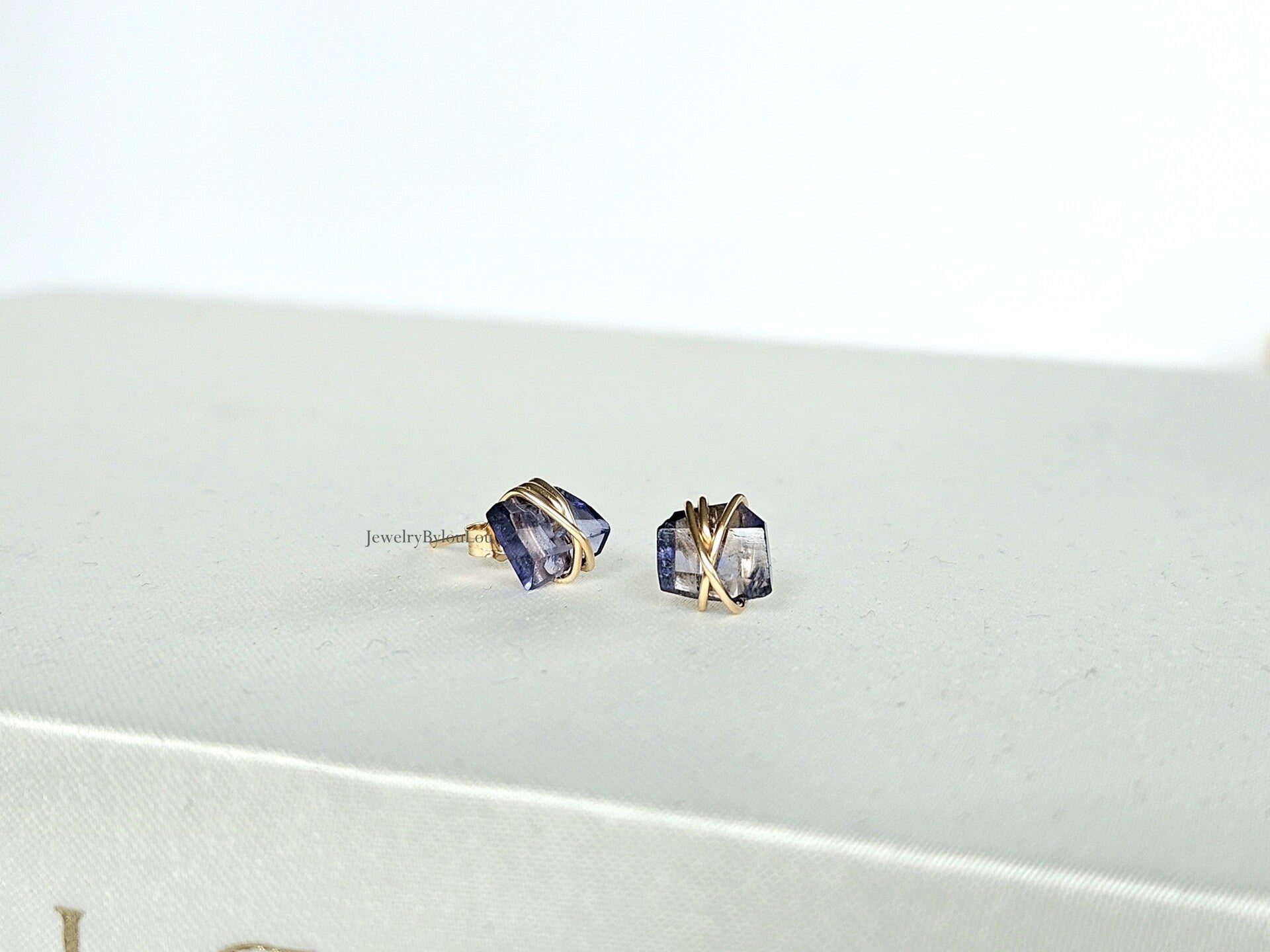 Charming handmade small gemstone stud earrings with faceted AAA quality Iolite beads. The purple blue stones are undyed, and free-form cut, so each stone is unique.