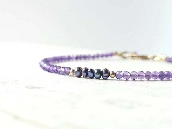 Amethyst and peacock pearl beaded bracelet, 14k gold-filled - 925 sterling silver