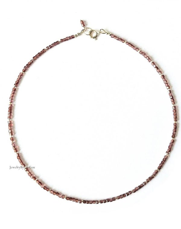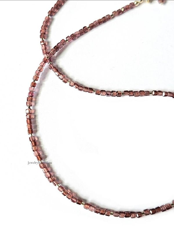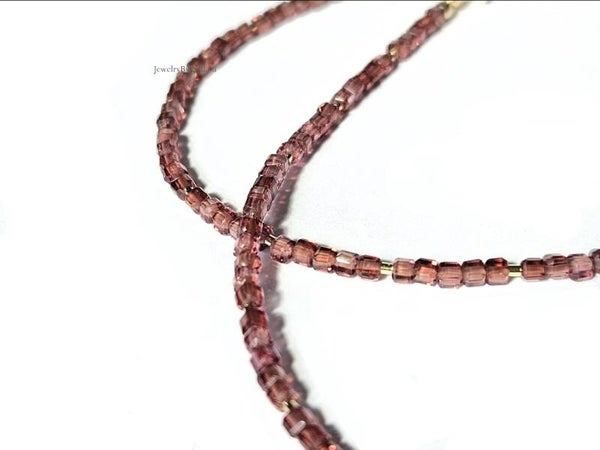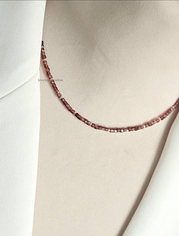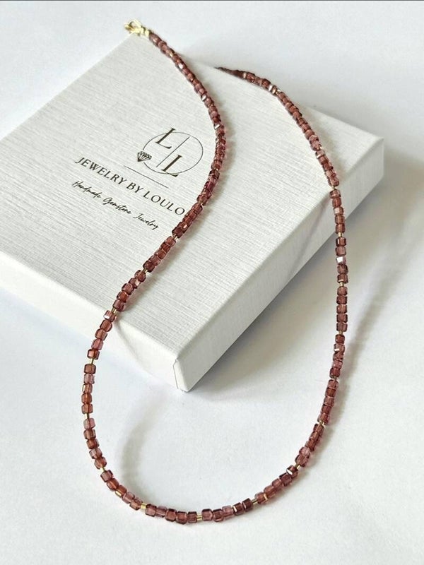 Delicate, fine necklace with natural, untreated AAA Malaya Garnet beads. These top-quality beads have a beautiful warm chocolate color and shine and are faceted into a 2mm cube shape.