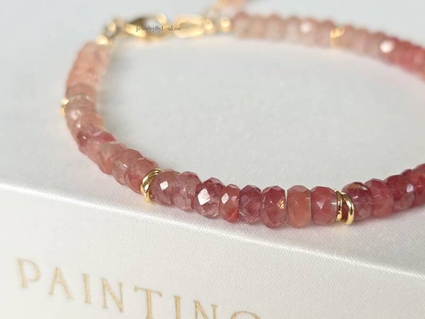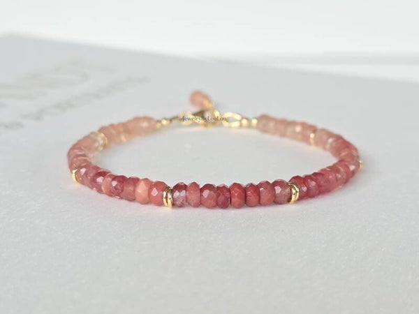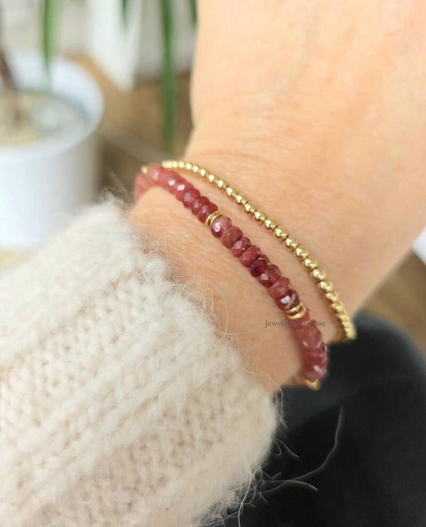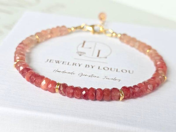 The color of these andesine beads are so beautiful, with a bright soft pastel color to warm peach red. We've combined them with 14k gold-filled rings, giving this bracelet a timeless look. Pair them with one of our basic bracelets.