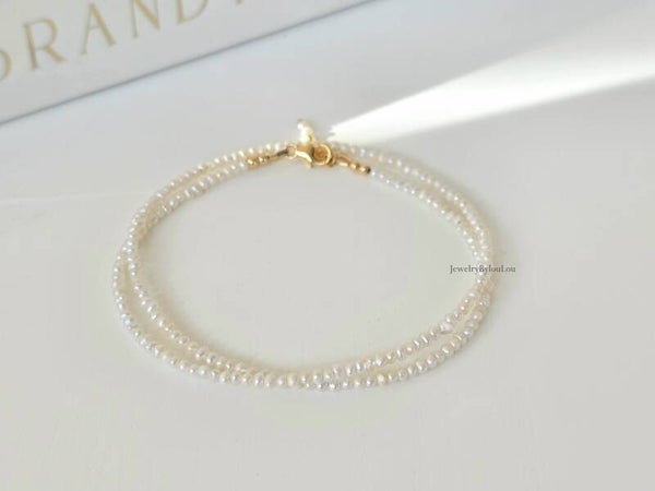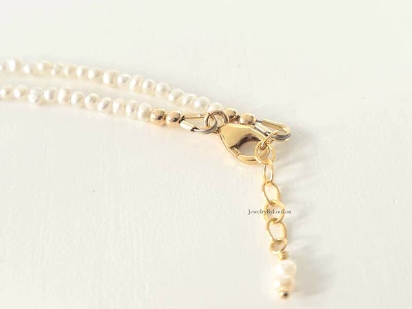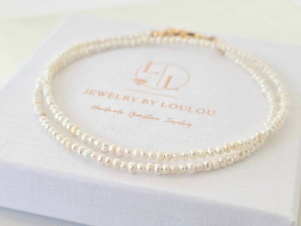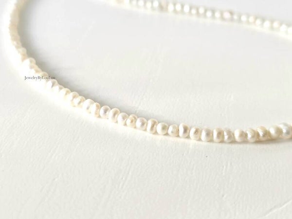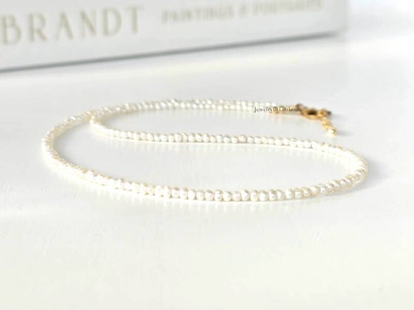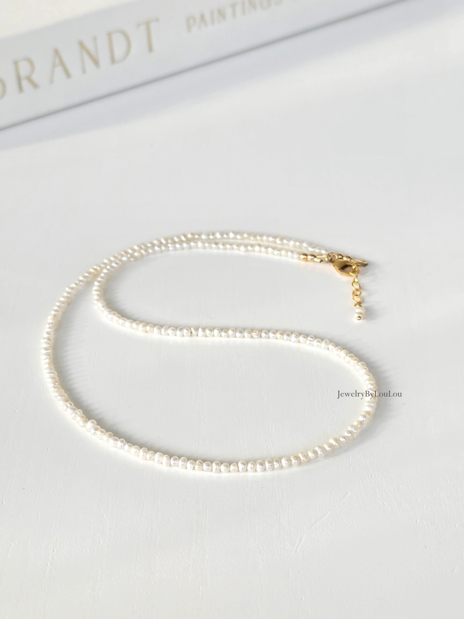 A minimalist pearl beauty with the smallest freshwater pearls beads. Beautiful to wear on its own or to combine with our other necklaces.