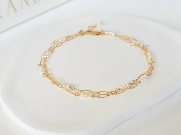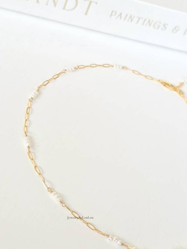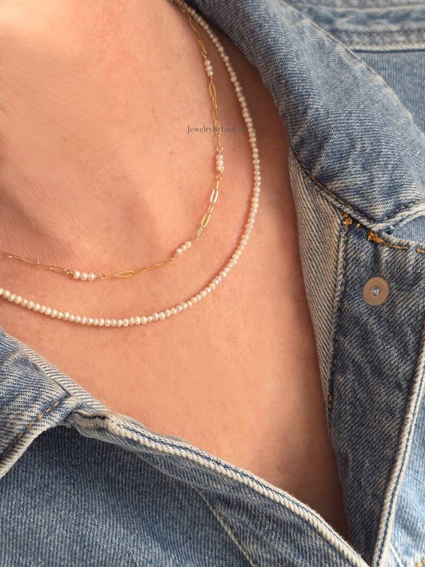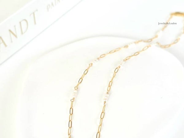 A minimalist paperclip chain necklace with the smallest freshwater pearls beads. Beautiful to wear on its own or to combine with our other necklaces.