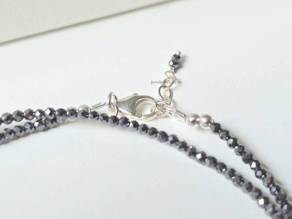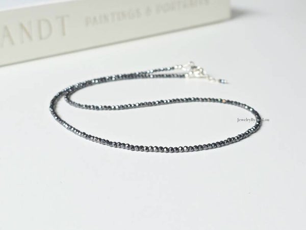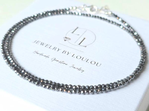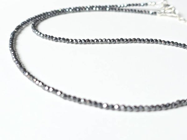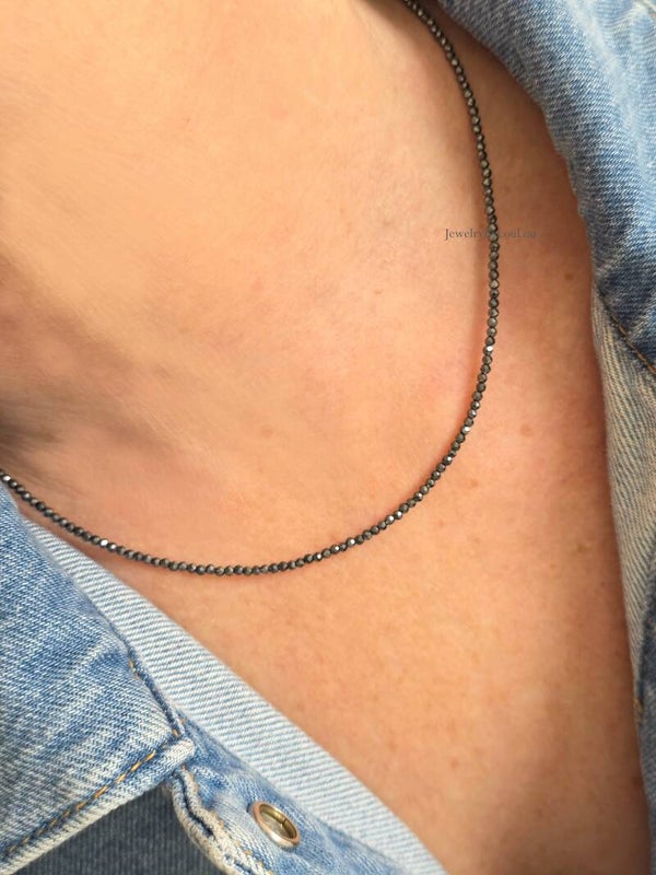 A minimalist dark grey sparkling delicate necklace with the smallest Spinel beads. Beautiful to wear on its own or to combine with our other necklaces.