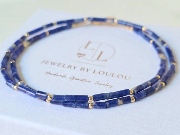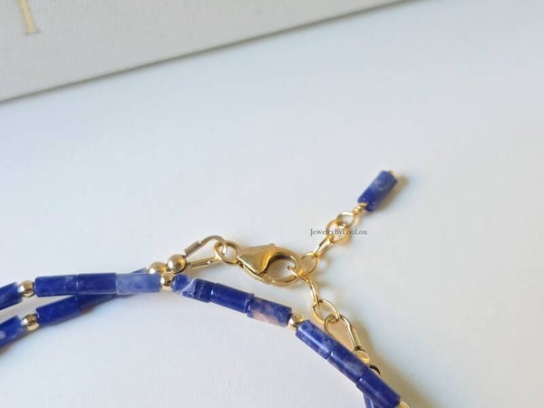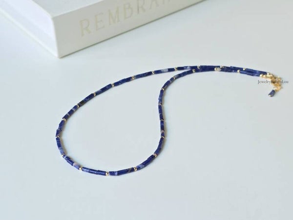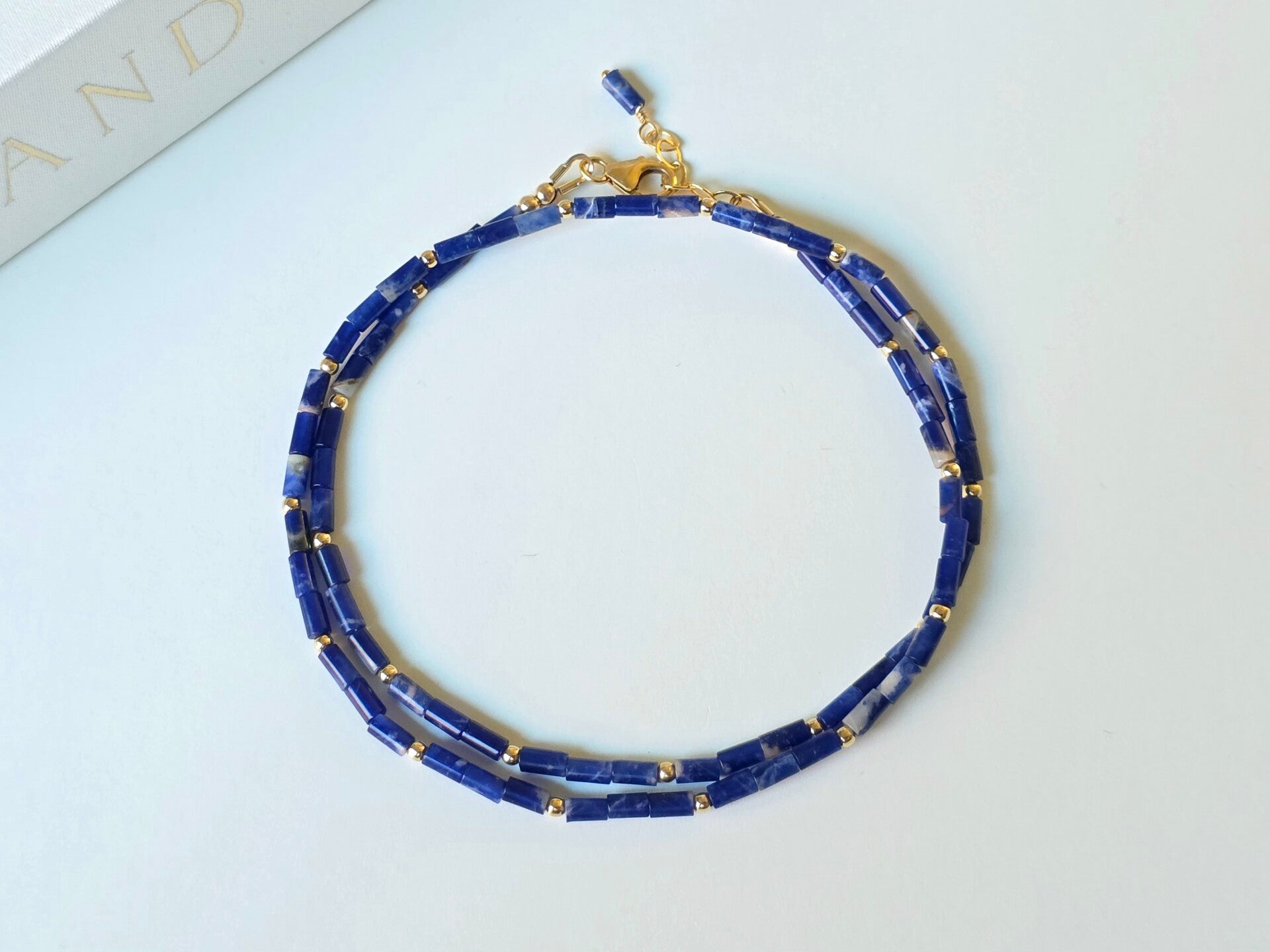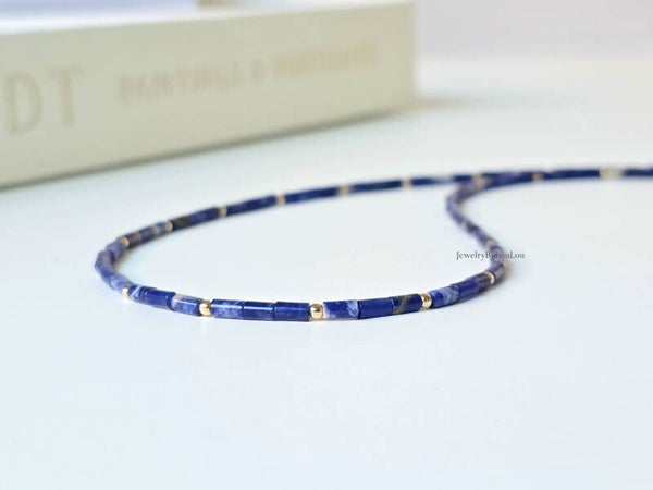 Delicate, fine choker necklace with natural, untreated AAA blue sodalite tube beads. These high-quality beads have a beautiful deep blue color with occasional soft orange and white inclusions.