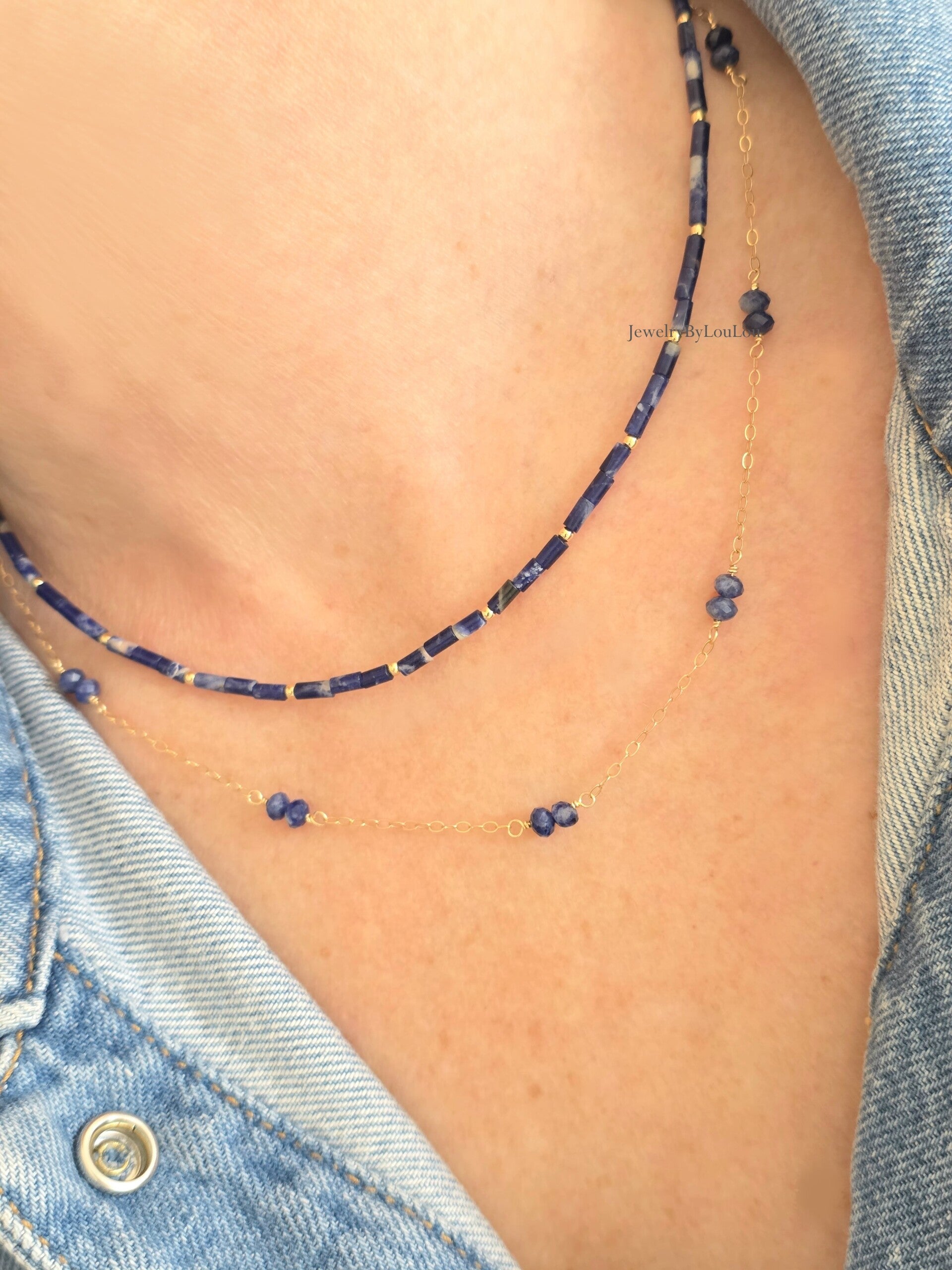 Sodalite beaded choker necklace 2mm, 14k gold-filled, 925 sterling silver