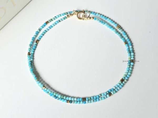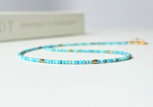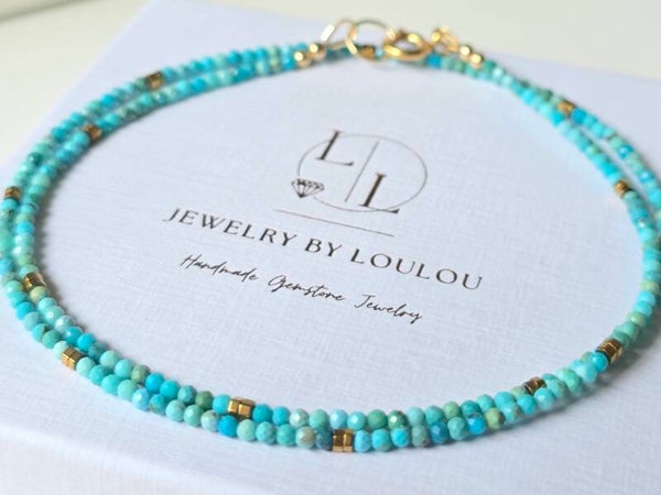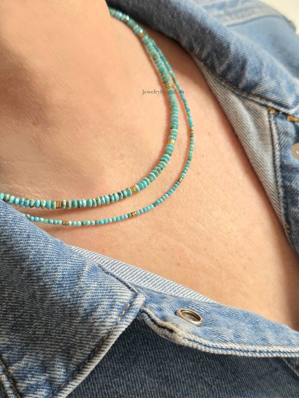 This delicate natural turquoise choker necklace reveals all the beauty of this stunning gemstone. The sleek design combined with the golden hematite beads makes it a timeless piece, easy to wear alone for a touch of refinement or paired with other jewelry for a grander style.