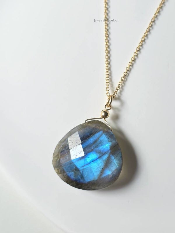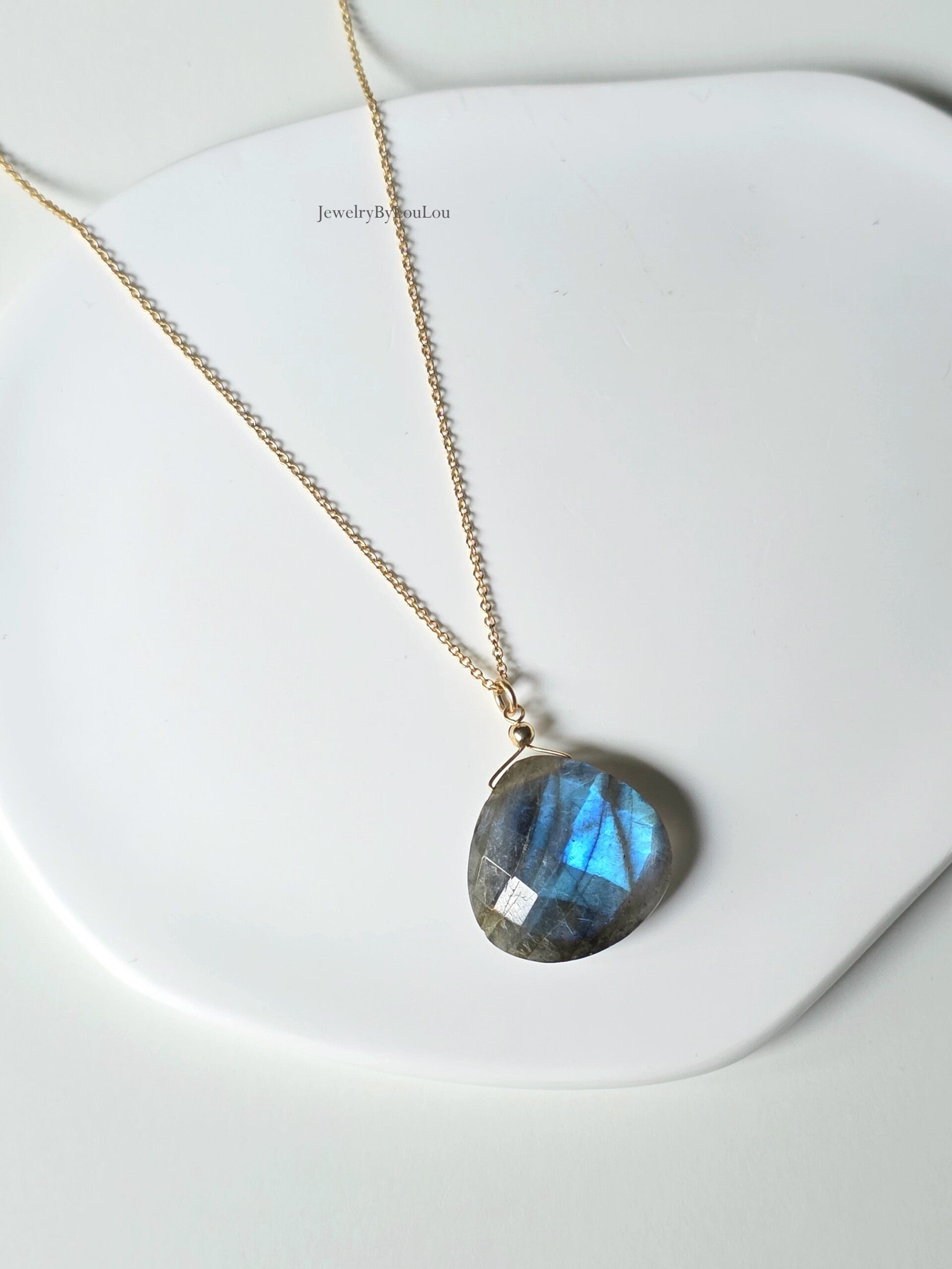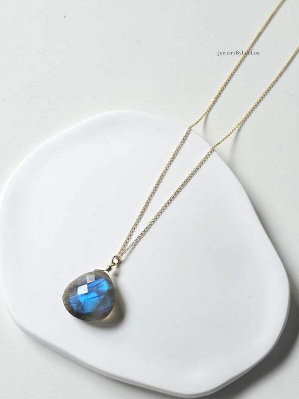 Refined and lovingly crafted, this beautiful necklace features a faceted labradorite drop with a blue glow. Paired with a delicate 14-karat gold-filled chain, it exudes subtle beauty... a gift for yourself or to give to a loved one.
