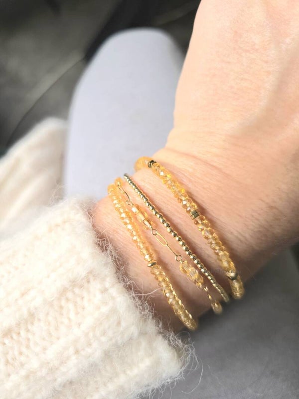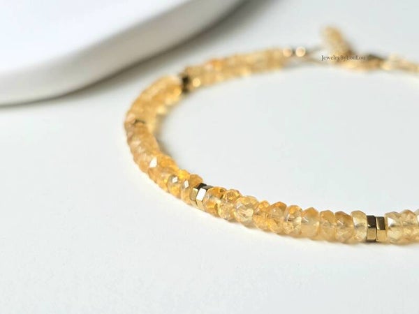 This beautiful bracelet embodies the warmth of the sun, composed of faceted soft yellow citrine beads and a 14k gold-filled spacer. Citrine is a sunny and warming stone and this bracelet combines the warmth of the citrine beads with the beautiful golden Hematite beads for a touch of sparkle.