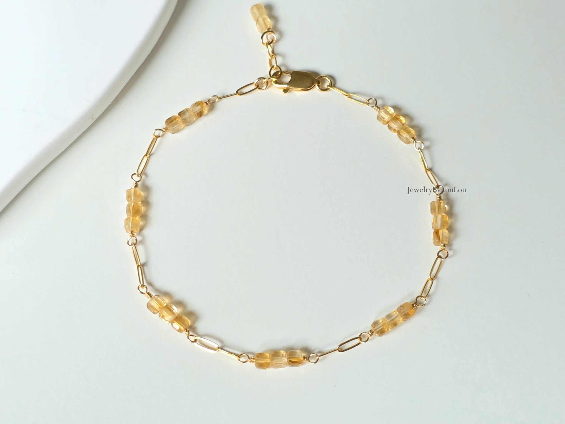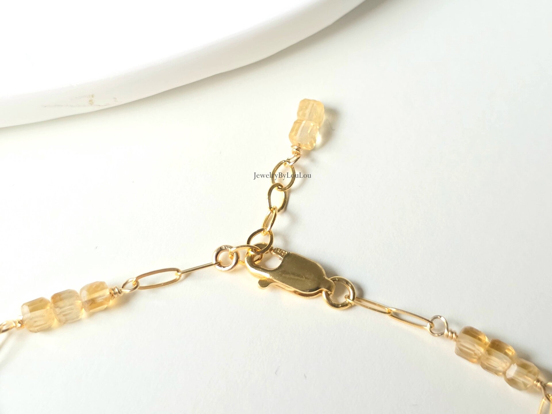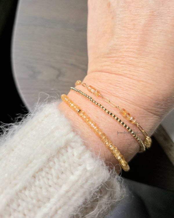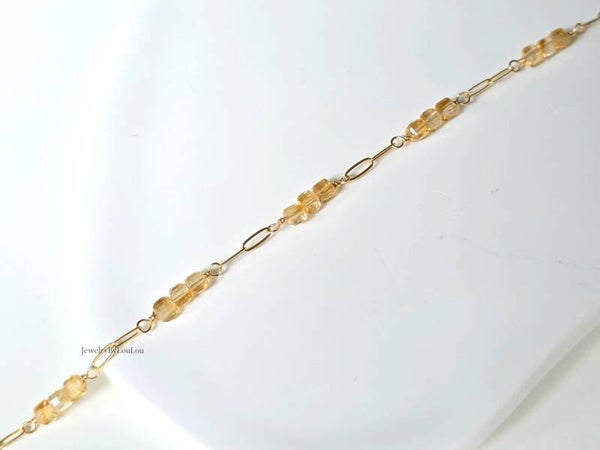 This beautiful bracelet embodies the warmth of the sun, and the delicacy of the small paperclip link chain, composed of faceted soft yellow citrine beads. Citrine is a sunny and warming stone and Its minimalist design makes it a timeless piece, easy to wear on its own for a touch of green or in combination with your other treasures.