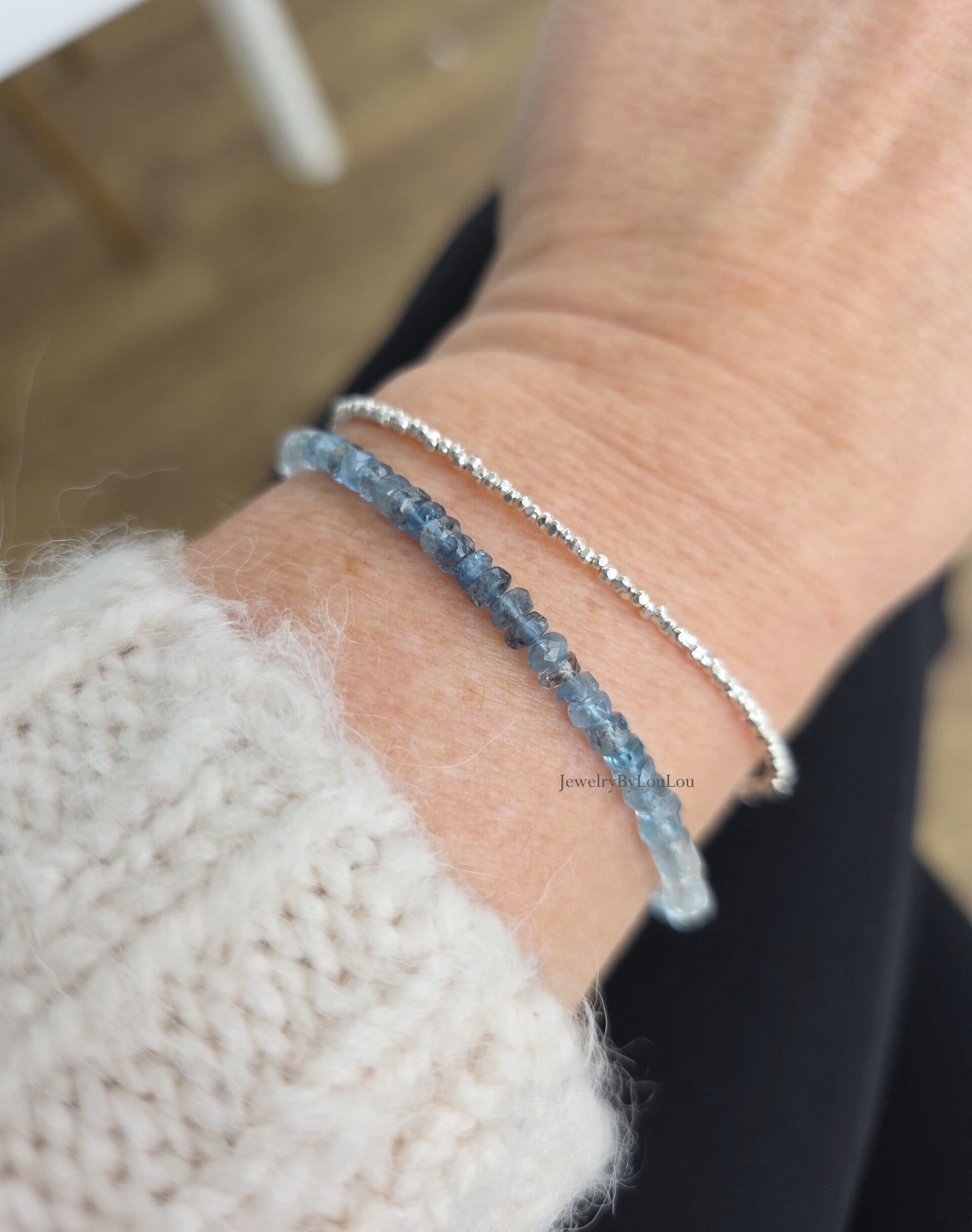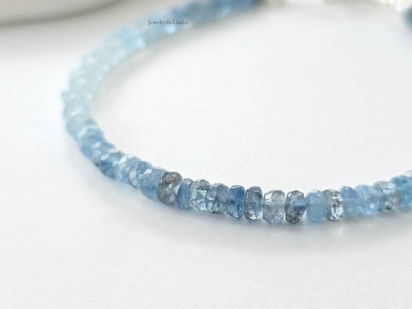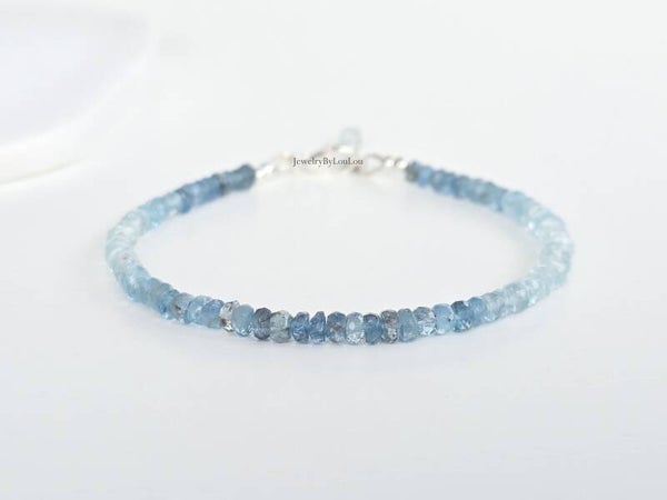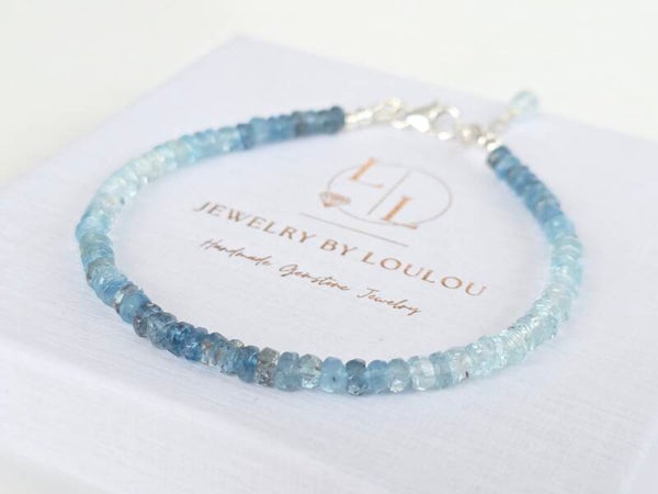 A beautiful bracelet with ombre Aquamarine beads in 4mm. This bracelet has a beautiful color gradient from dark to light blue, which gives the bracelet a beautiful appearance. Beautiful to wear on its own or to combine with our other bracelets.