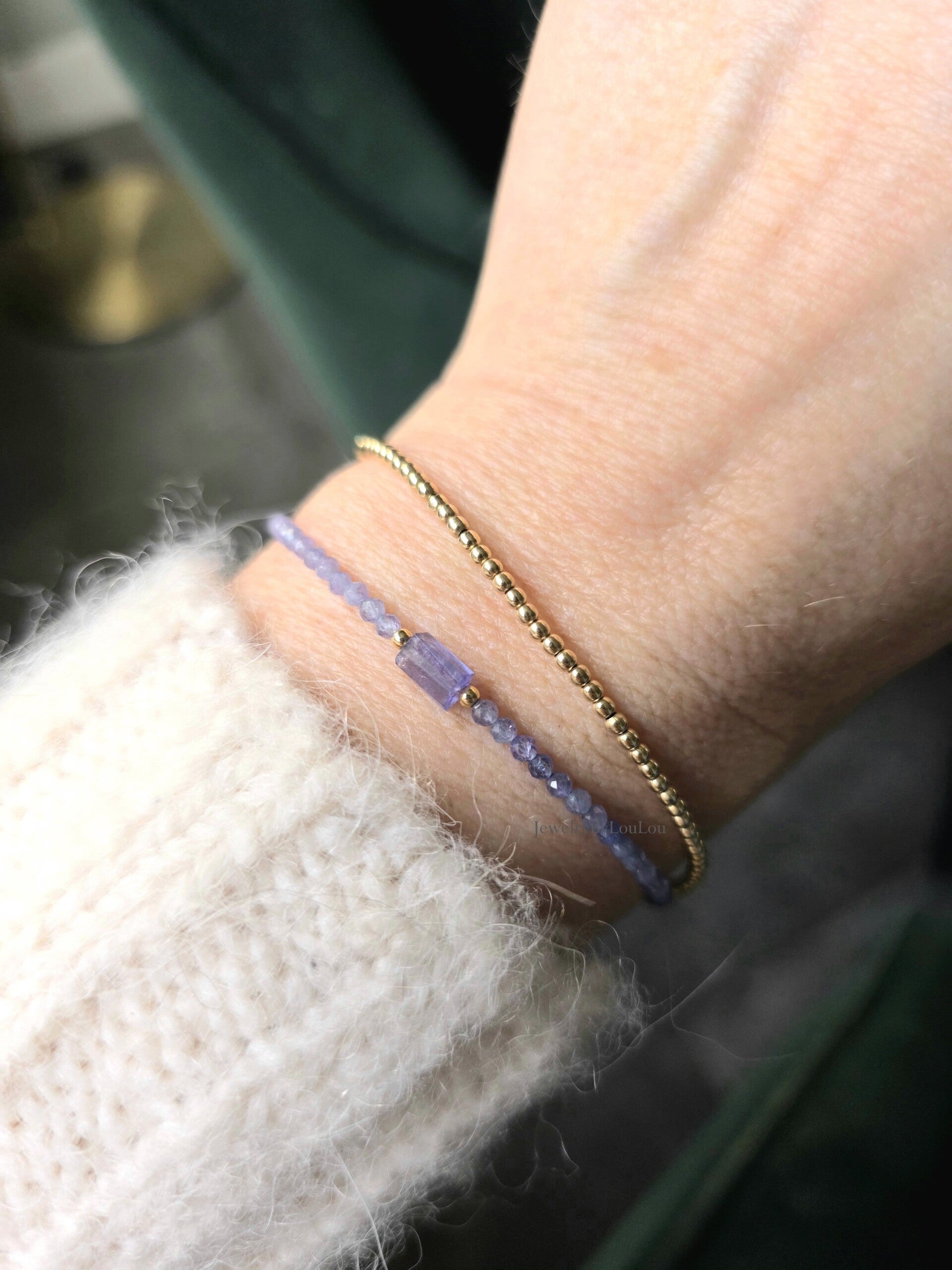 Een minimalistische armband met tanzanietkralen van 2 mm en 1 ongeslepen ruwe tanzanietkraal in het midden. Prachtig om alleen te dragen of te combineren met onze andere armbanden.