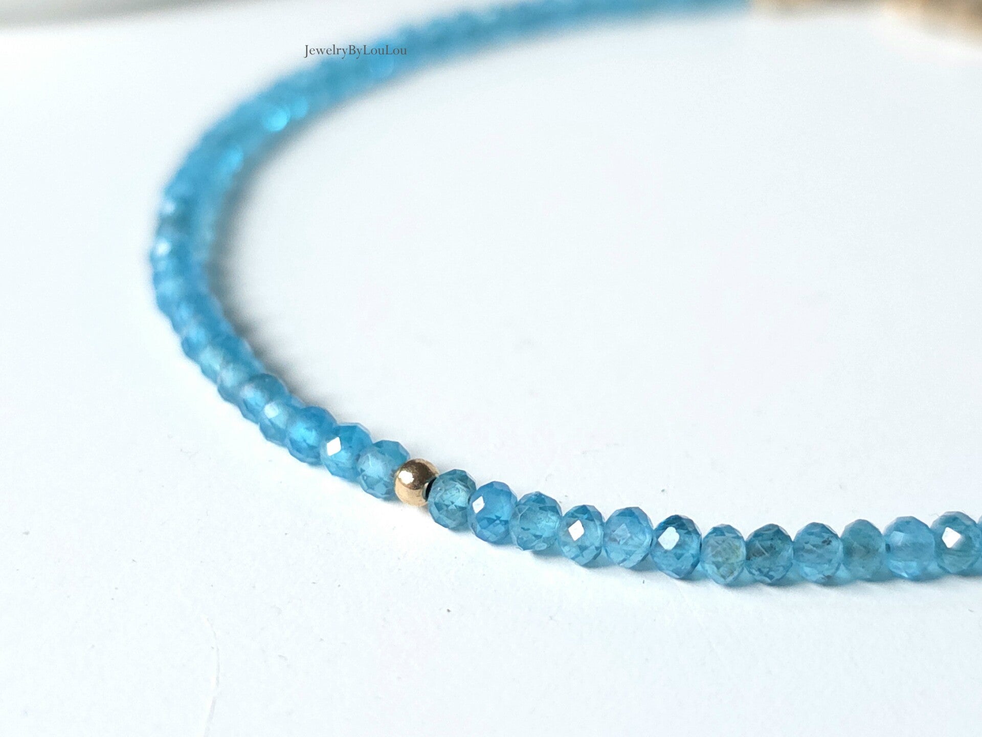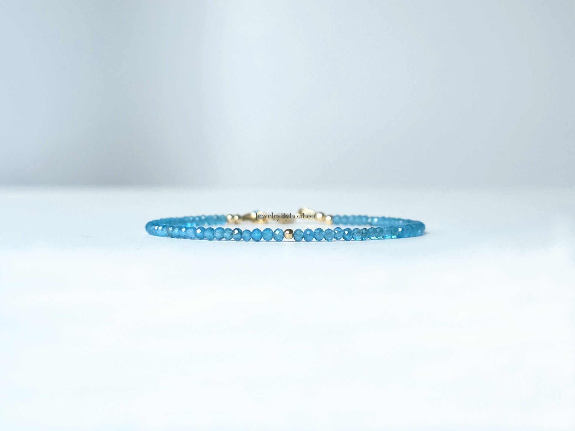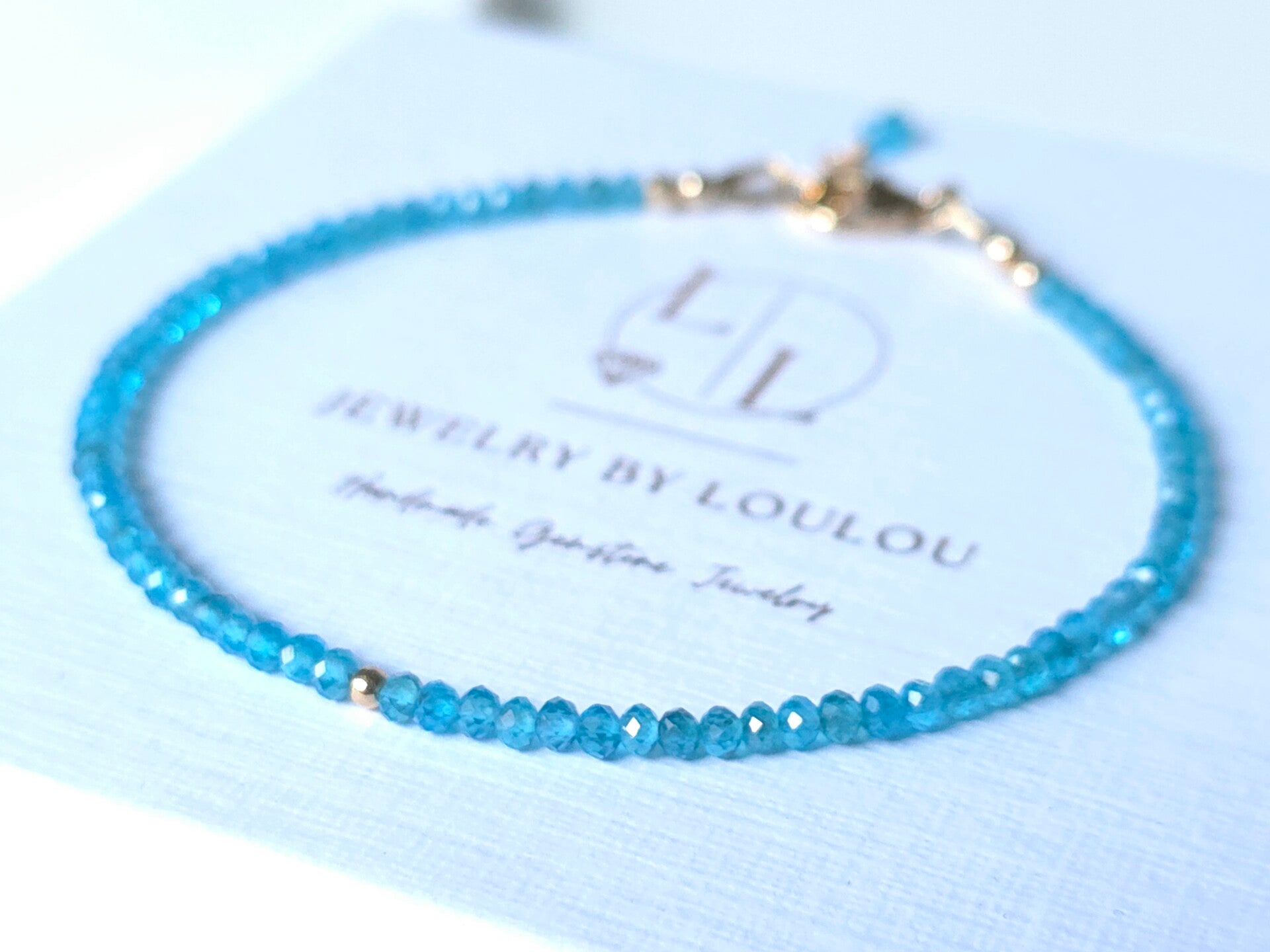 Prachtige armband met natuurlijke facet geslepen neon Apatiet kralen. De diep aqua blauwe kralen zijn zo prachtig van kleur dat ik verder niets heb toegvoegd aan het ontwerp van de armband.