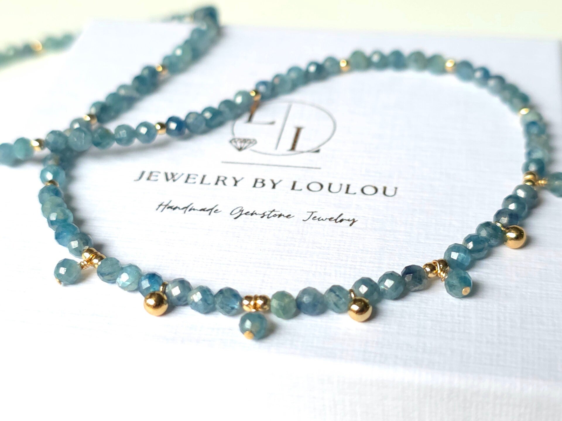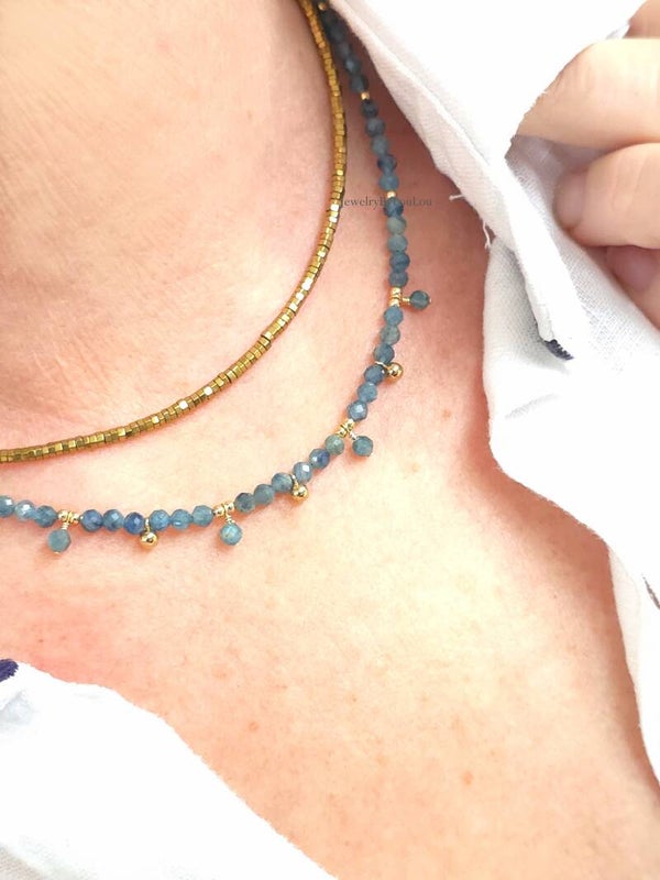 De kleur en glans van deze natuurlijke Kyaniet ketting is zo mooi, het heeft antraciet-groen-blauwe tinten. Verder zitten er 14k goldfilled kralen bedeltjes tussen verwerkt, waardoor ze een tijdloze uitstraling krijgt. Combineer ze met vele andere kettingen of draag ze als een eyecatcher.